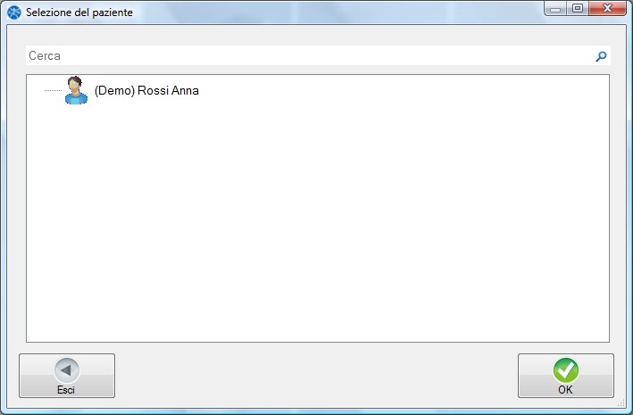 La finestra consente di selezionare un paziente tra quelli inseriti.