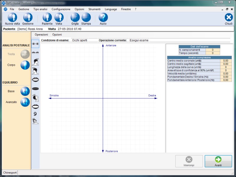 L' esame puņ essere effettuato nelle varie condizioni di esame del paziente che sono selezionabili sulla barra verticale sulla parte sinistra della finestra.