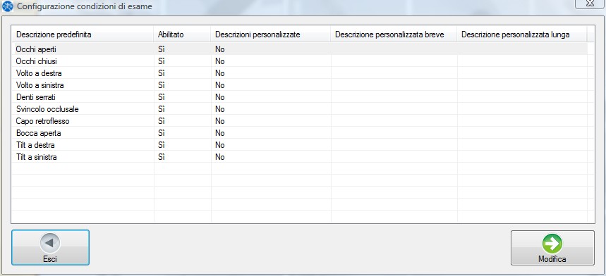 La configurazione delle condizioni di esame consente di abilitare, disabilitare e modificare le descrizioni delle condizioni di esame predefinite.